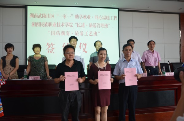 9月17日,由湖南中华职业教育社组织的湖南武陵山区“一家一”助学就业·同心温暖工程 “国药湖南·旅游工艺班”签约仪式在湘西民族职业技术学院举行。省委统战部有关领导、捐助企业代表、湘西民族职业技术学院领导及受资助的特困家庭应届大学新生参加了签约仪式。国药控股湖南有限公司行政总监罗戎代表公司出席。