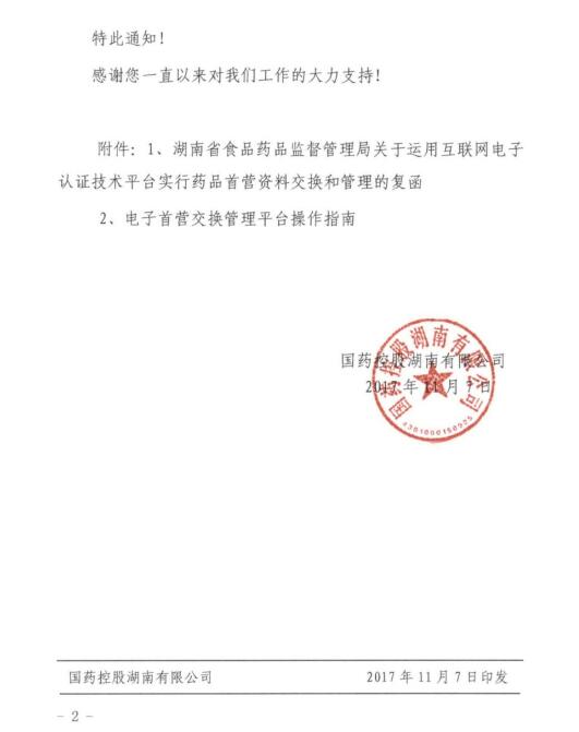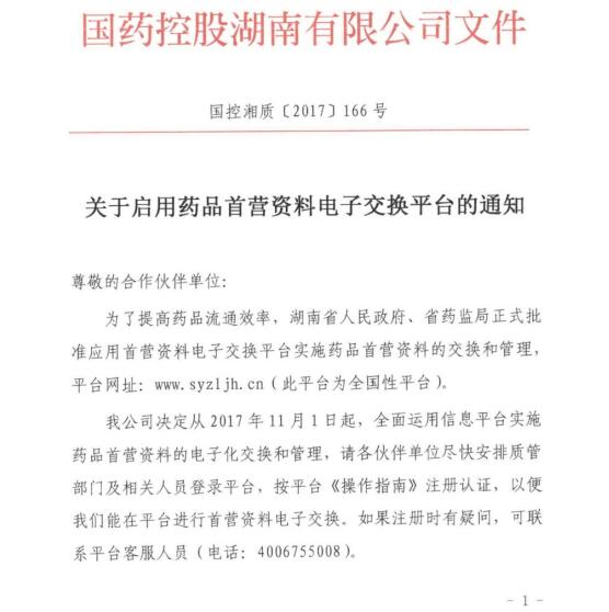 国控湖南关于启用药品首营资料电子交换平台的通知